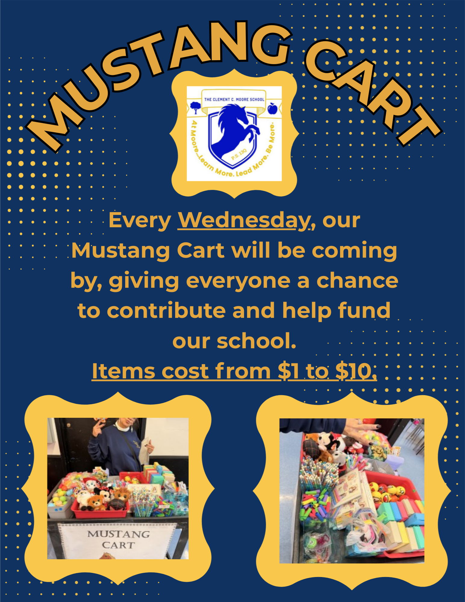 Every Wednesday, our Mustang Cart will be coming by, giving everyone a chance to contribute and help fund our school.